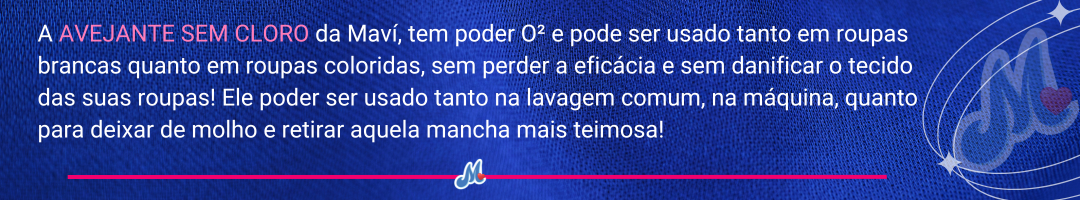 O Alvejante da Maví, pode ser usado tanto em roupas brancas quanto em roupas coloridas. A melhor forma de uso, é fazer a diluição conforme consta na embalagem e deixar as peças manchadas de molho por meia hora antes da lavagem na máquina. Pode-se colocar duas colheres de sopa do Alvejante na máquina de lavar, juntamento com o Lava Roupas líquido, para manter as roupas sem manchas!